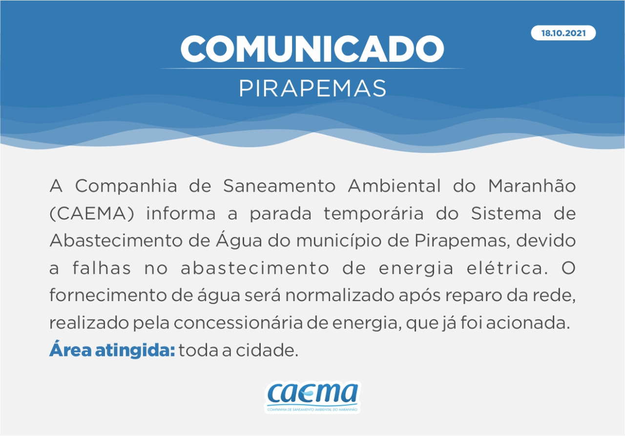 A falta de água que está afetando a vida dos moradores de Pirapemas, é, segundo comunicado Companhia de Água e Esgoto do Maranhão (CAEMA), devido as constantes oscilações de energia no município, o que impede o funcionamento de 100% da bomba, que inclusive, devido a esta problemática, já queimou por várias vezes.